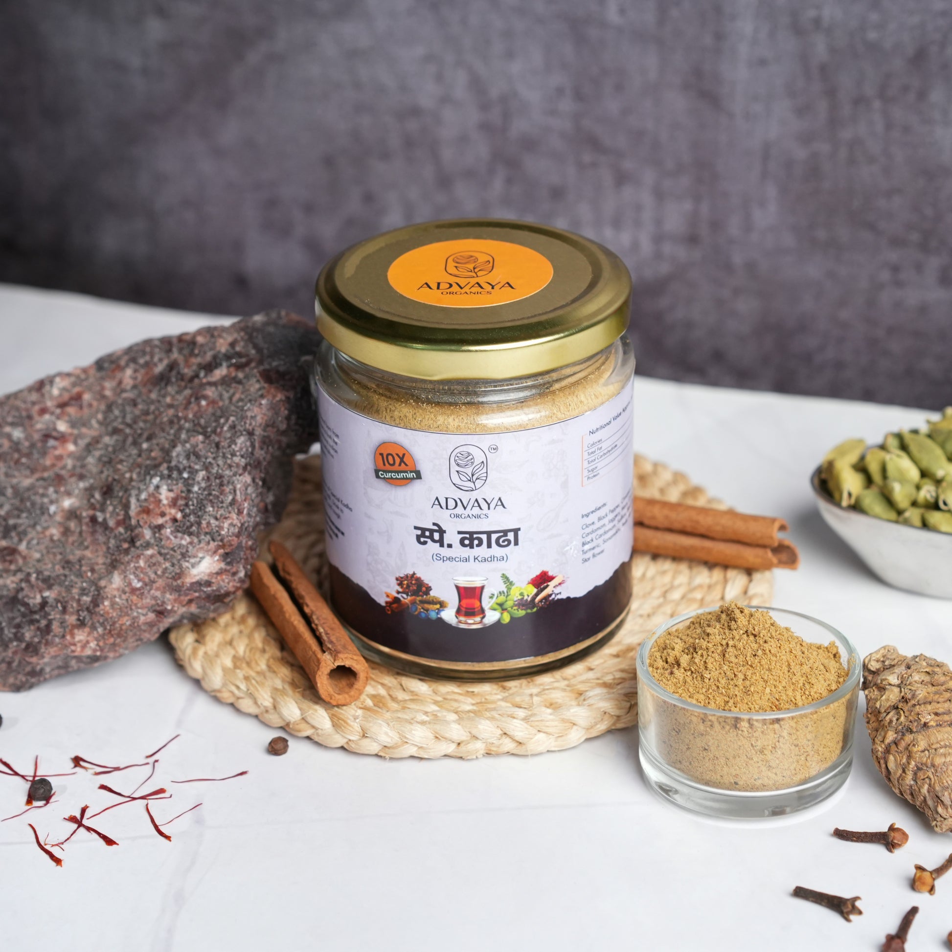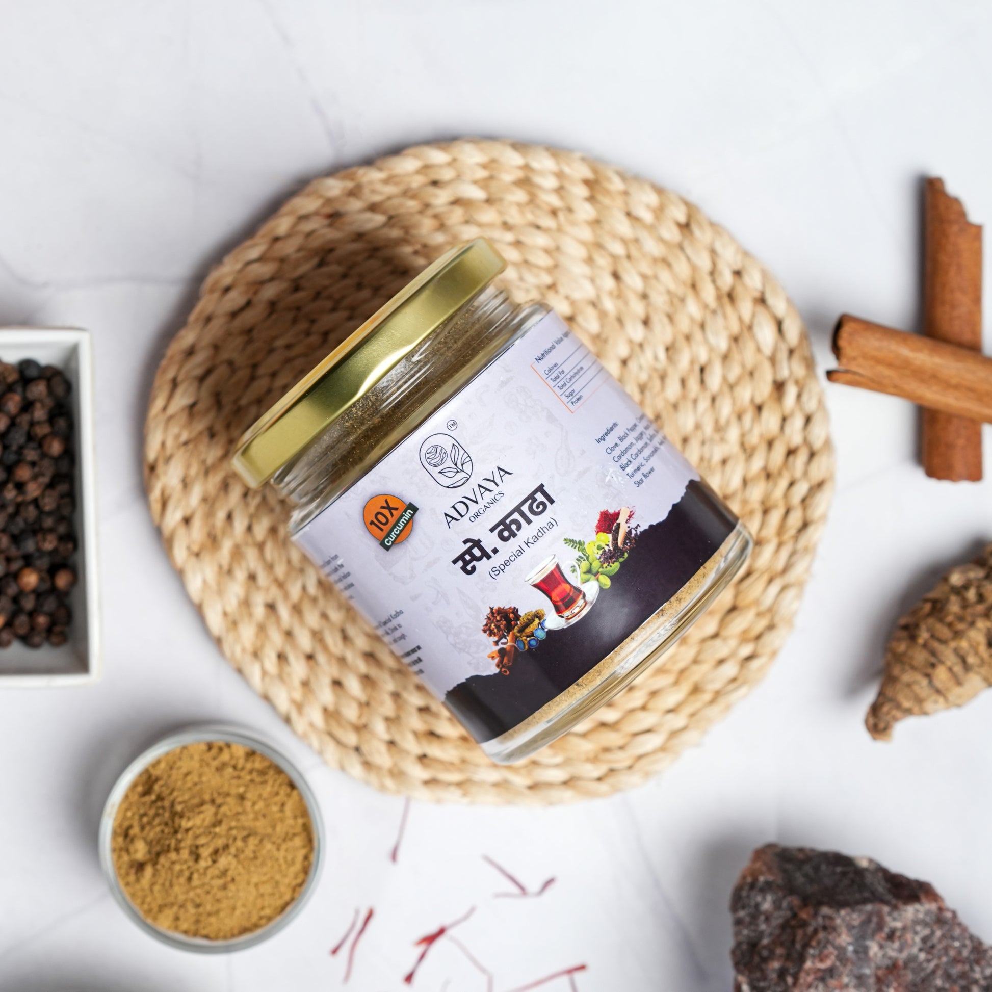Special Kadha Pack Ingredients: Clove, Black Pepper, Cinnamon, Dry Ginger, Cardamom, Jaggery, Mace, Celery, Bhulbhul, Black Cardamom, Saffron, Black Salt, Samamsha, Amla, Myrobalan, Star Flower